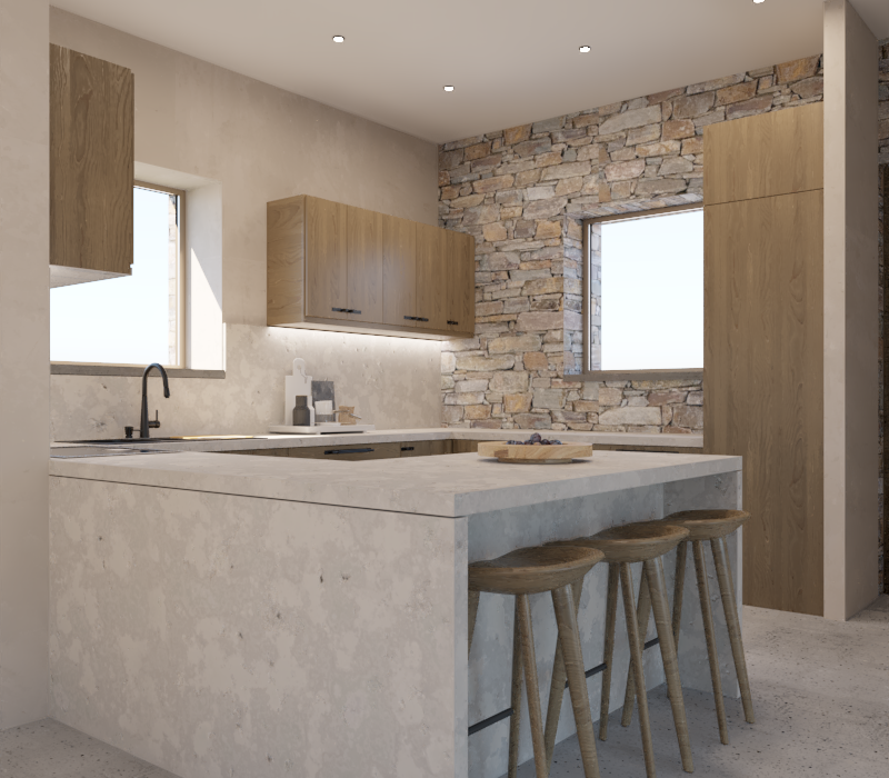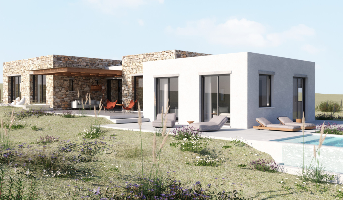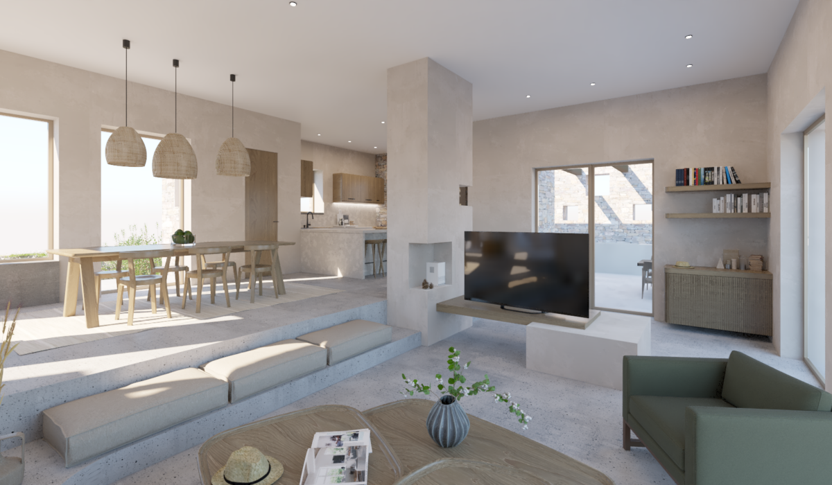 Die offenen Räume, die von natürlichem Licht durchflutet sind, laden die Gäste ein, das Gefühl von Freiheit und Verbindung mit der Natur zu genießen, während die großen Fenster einen herrlichen Blick auf die kretische Landschaft bieten. Die Residenzen verfügen über eine moderne Küche und ein offenes Wohnzimmer, perfekt für entspannende Momente oder gesellige Zusammenkünfte mit Freunden und Familie.