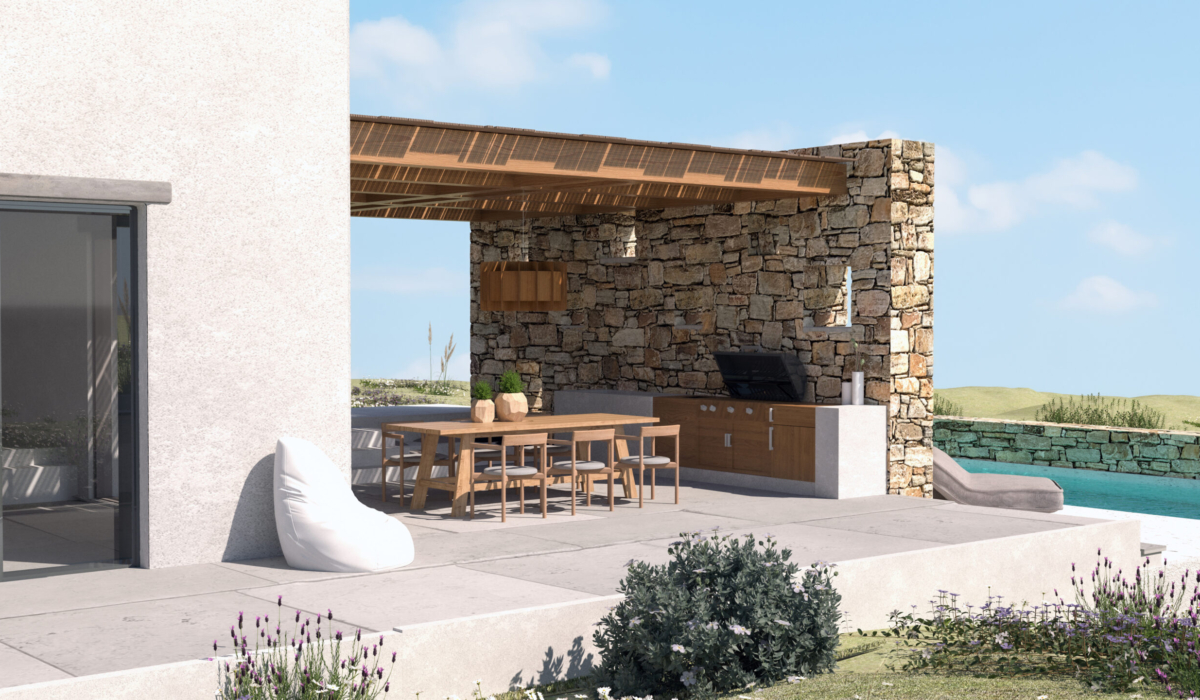 The open spaces, bathed in natural light, invite guests to enjoy the sense of freedom and connection with nature, while the large windows reveal stunning views of the Cretan landscape. The residences feature a modern kitchen and open-plan living area, perfect for moments of relaxation or social gatherings with friends and family.